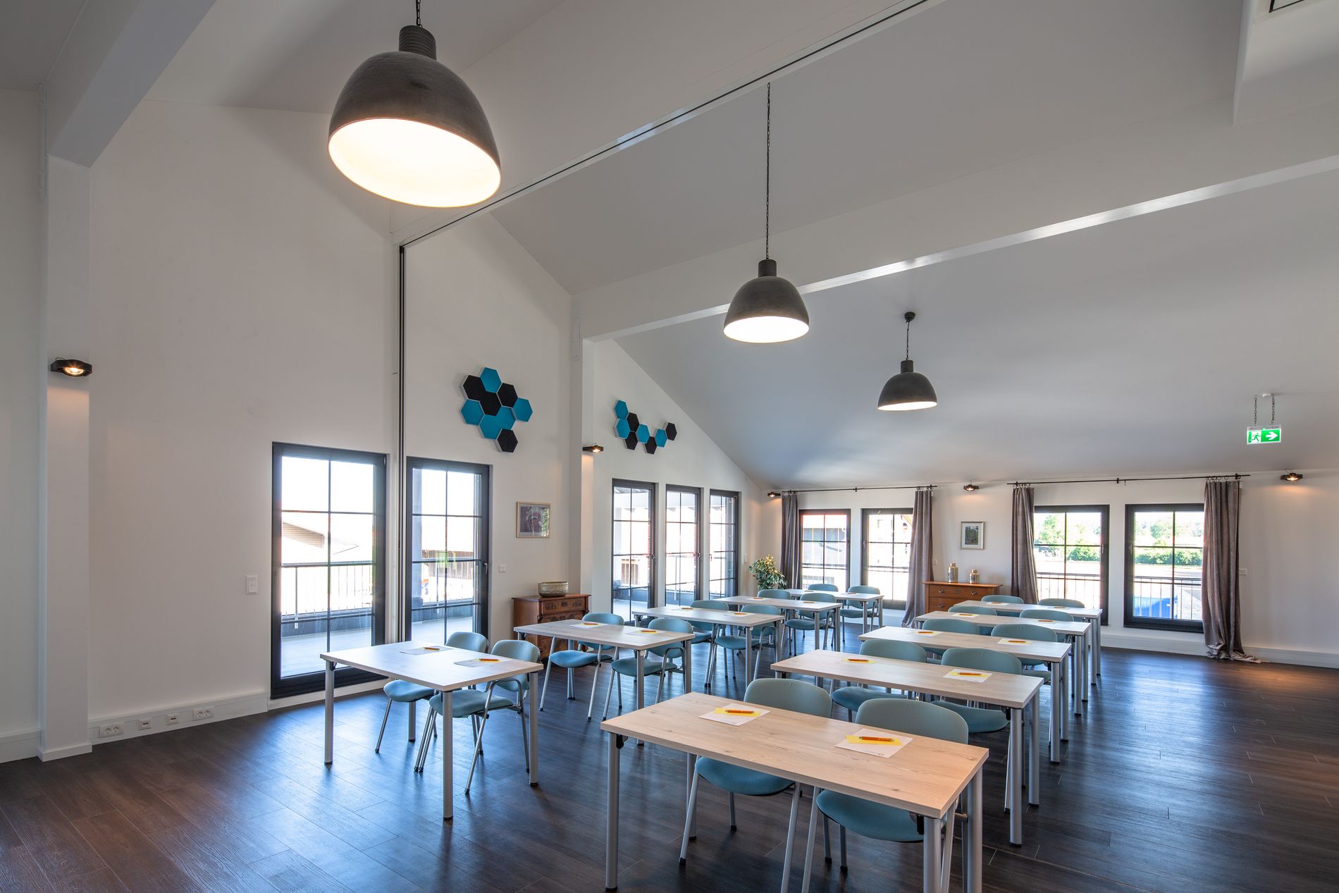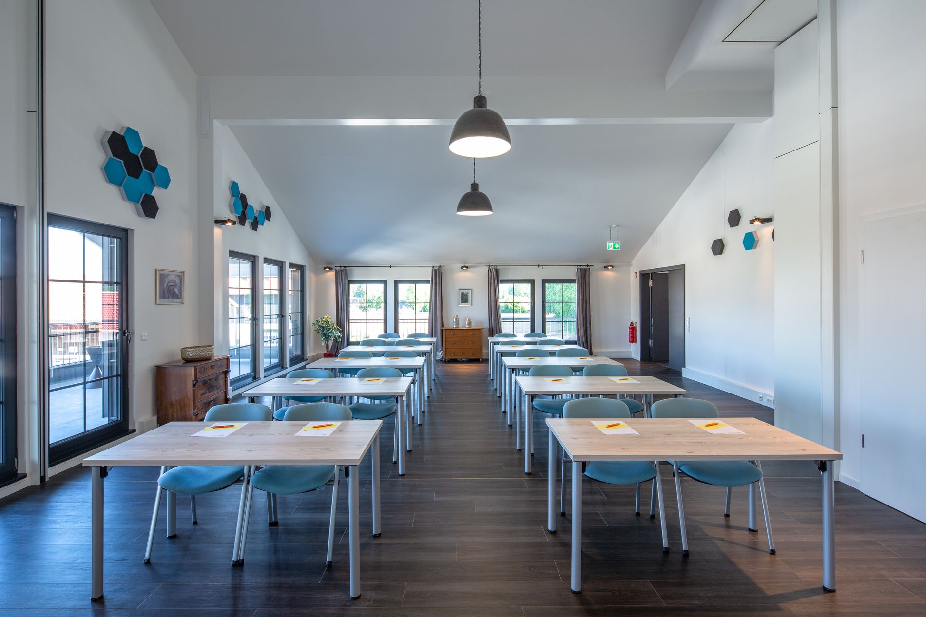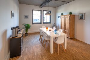 Hohe, lichtdurchflutete Räume schaffen eine entspannte Atmosphäre für Veranstaltungen mit, je nach Bestuhlung, bis zu 20 Teilnehmern.